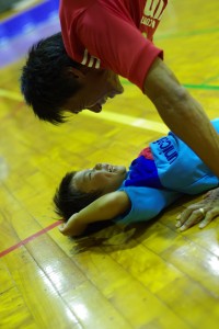 夜のお楽しみ、体育館でのフットサルの合間の風景。 島っ子はたくましく育っていきます。この親子は格別ですが。