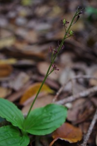 戦跡ツアー中に、風にゆらゆら黒いかげ。 よーく見ると、小さな黒っぽいランの花が。 夜明山は、実は戦跡以外もシュスランなど見どころがあります。