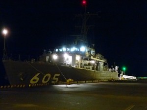 海上自衛隊の艦艇には、様々な地名や自然現象由来の名前が付いていますが、 今年の3月に「ちちじま」の名を冠した掃海艇が完成したそうです。 (「ちちじま」の名前が採用されるのは初!) 早速とばかりに、 島にやってきてくれました。 島でも歓迎の催しがあったようで、昼間は艦内を見学もできたみたい。 残念ながら見学には間に合わなかったので、夜こっそり写真を一枚撮りに行きました。