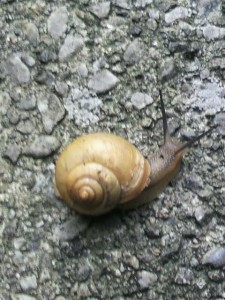 このところ、頻繁にスコールのような雨が降る事が多いです。 じめじめして喜んでいるのは、、陸産貝類、かたつむりの皆さんですね。 先日の葉隠れくんとは違い、地面を這っていました。 殻も厚く、大柄、角もにょっきり立派です。 踏まれないように祈るばかりです。